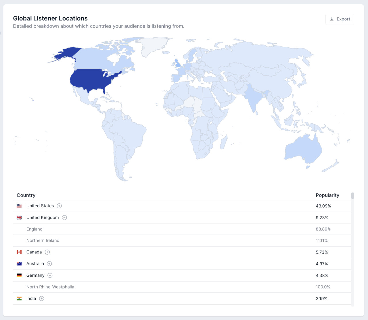 You can now view your audience listenership percentage rates a state, province or region level within a country. This data is now available for most countries.